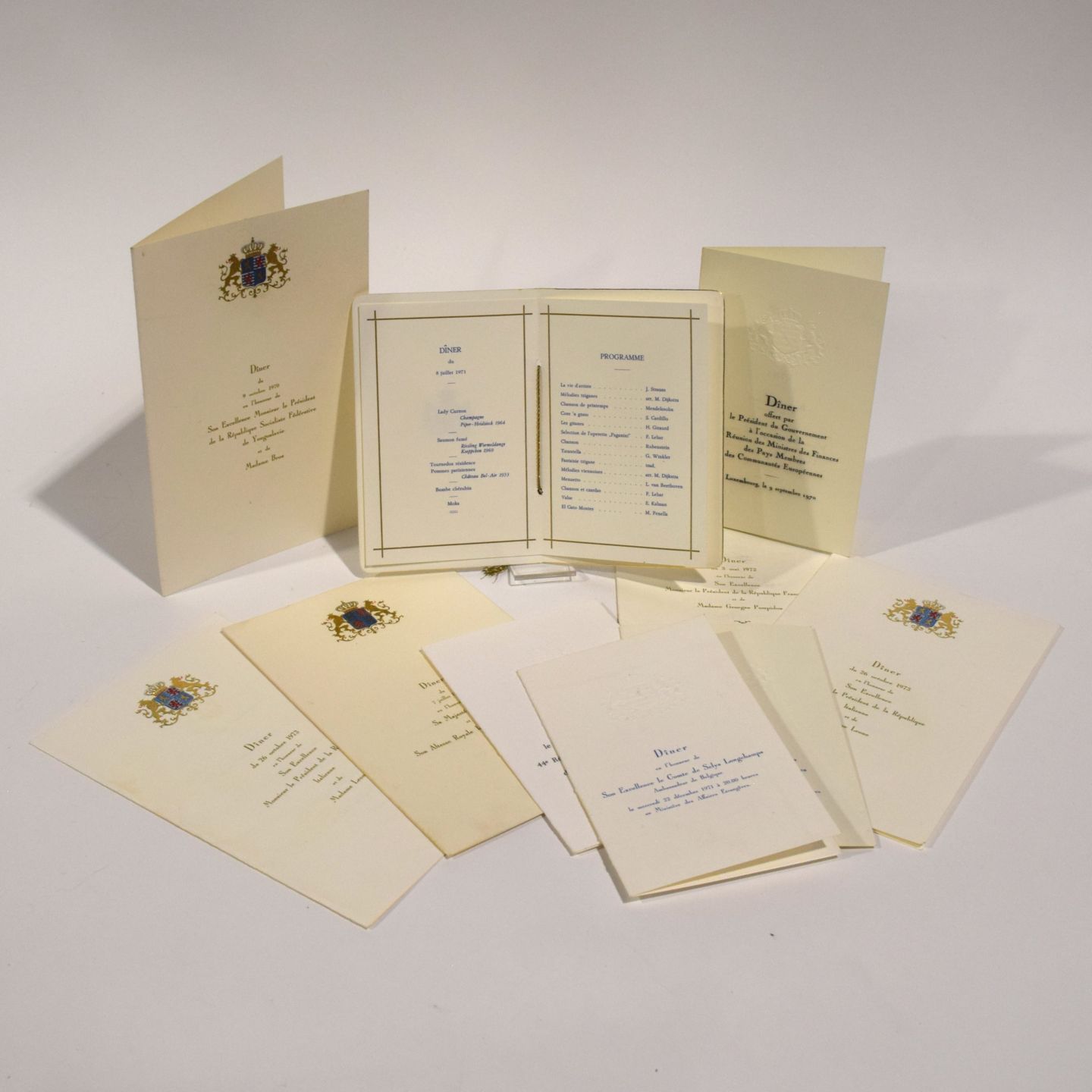 DYNASTIE. Treffen mit offiziellen Einladungen des Hofes oder der Regierung anlässlich offizieller Besuche: 1) Abendessen für den Außenminister der Niederlande (M. Luns). Luns), 1970, 2) Abendessen für Graf de Selys Longchamps, Botschafter von Belgien, 1971, 3) Abendessen für das 36. Treffen der Finanzminister, 1970, 4) Abendessen für das 44. Treffen der Finanzminister, 1973, 5) Abendessen am 8. Juli 1971, 5) Abendessen für den jugoslawischen Präsidenten Tito 1970, mit einer Broschüre der gehaltenen Rede, 6) Abendessen für den französischen Präsidenten Pompidou 1972, 7) (x2) Abendessen für den italienischen Präsidenten Leone 1973, 8) Abendessen für die Königin der Niederlande 1971.