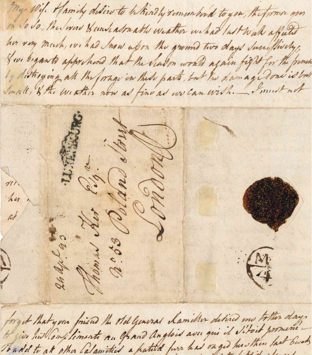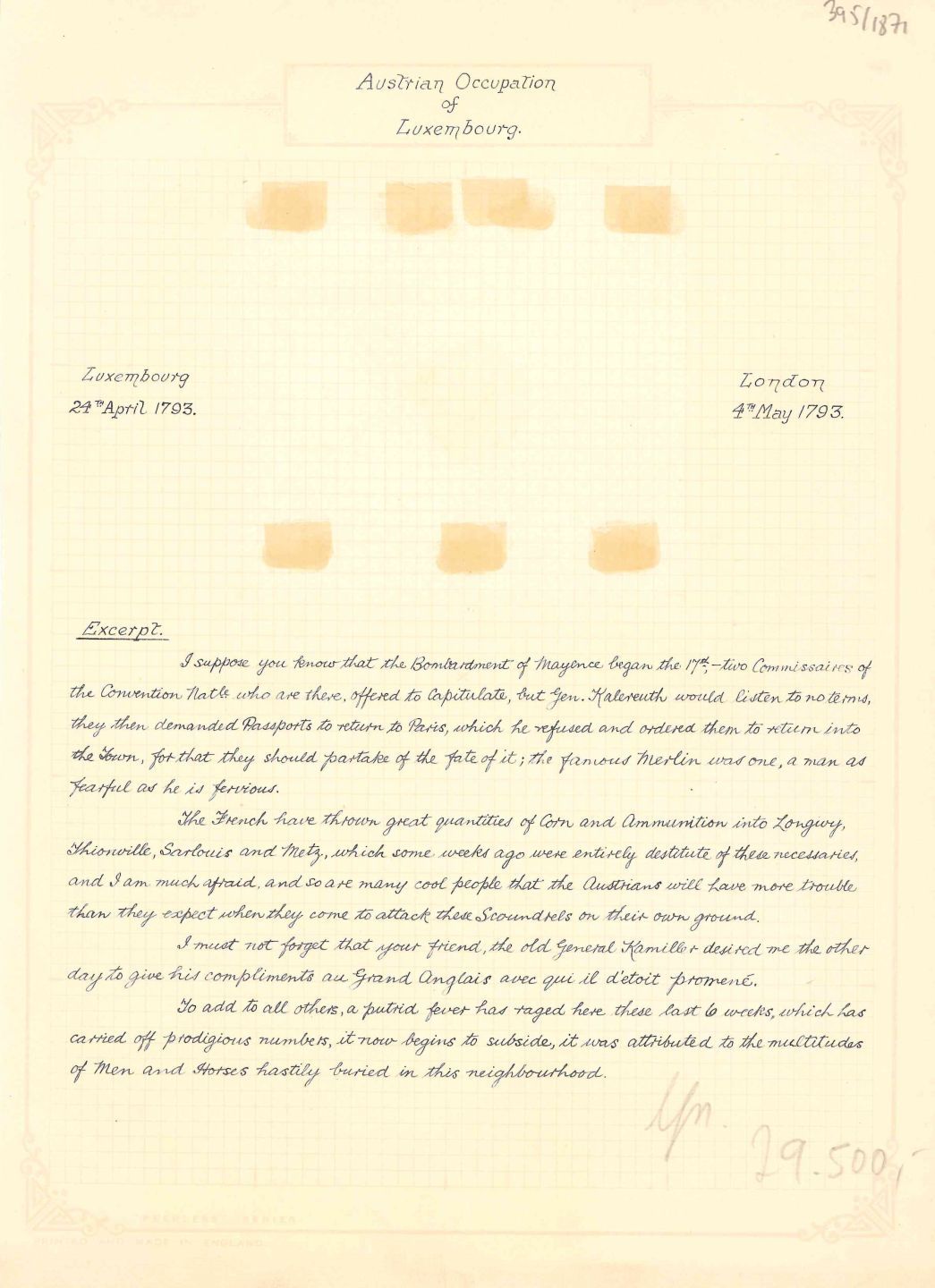 LETTER. Interessanter Brief eines britischen Bürgers aus dem österreichisch besetzten Luxemburg vom 24. April 1793 (Poststempel) nach London (Poststempel vom 4. Mai).