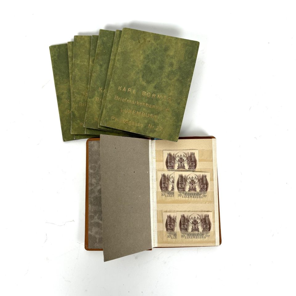Beiliegend Briefmarkenhefte aus der gleichen Zeit: 3 deutsche Briefmarken mit militärischen Motiven (1943-1944), 1 luxemburgische Briefmarke von 1939, 1 französische Briefmarke aus der Vichy-Zeit, 2 luxemburgische Briefmarken aus der Zwischenkriegszeit.