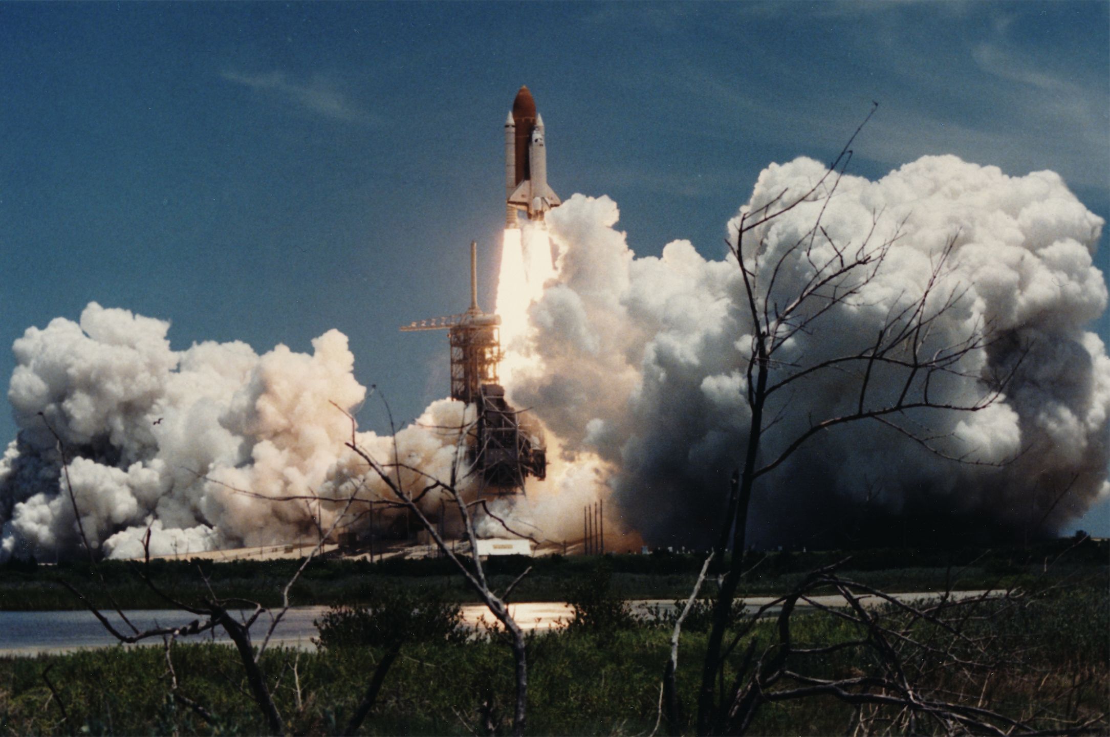 NASA. Panorama-Start des Space Shuttles COLUMBIA, aufgenommen durch das Sumpfgebiet von Florida. Juli 1994. Zeitgenössischer chromogener Abzug auf Papier: "Kodak Professional". NASA-Logo und Nummerierung am Rand auf der Vorderseite. NASA-Logo und handgeschriebene Legende auf der Rückseite. 20,2 x 25,7cm mit Rändern.