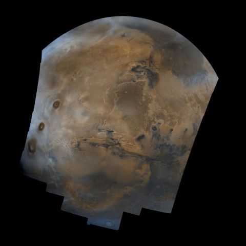 NASA. Der Planet MARS. GROSSES FORMAT. Außergewöhnliches Mosaik aus 102 Bildern des Mars, die vom Viking Orbiter aufgenommen wurden und fast eine ganze Hemisphäre des Planeten abdecken (ungefährer Breitengrad von -55 bis 60 Grad, Längengrad von 30 bis 130 Grad). Das Mosaik ist in Punktprojektion mit einem Maßstab von etwa 1 km/Pixel. Farbabweichungen wurden mit einem Faktor von etwa zwei verstärkt, und großflächige Helligkeitsschwankungen (hauptsächlich aufgrund von Änderungen des Sonnenwinkels) wurden durch eine großflächige Filterung normalisiert. Das Zentrum der Szene zeigt das gesamte Canyon-System von Valles Marineris, das über 3.000 km lang und bis zu 8 km tief ist und sich von Noctis Labyrinthus, dem bogenförmigen Grabensystem im Westen, bis zum chaotischen Gelände im Osten erstreckt. Die strahlend weißen Materialschichten in den östlichen Canyons könnten aus Karbonaten bestehen, die sich in alten Seen abgelagert haben. Riesige alte Flusskanäle verlaufen vom chaotischen Gelände und den Canyons im zentralen Norden in Richtung Norden. Viele dieser Kanäle flossen in ein Becken namens Acidalia Planitia, das die dunkle Fläche im äußersten Norden dieses Bildes ist. Der Landeplatz von Viking 1 (Mutch Memorial Station) befindet sich in Chryse Planitia, südlich von Acidalia Planitia. Die drei Tharsis-Vulkane (dunkelrote Flecken) mit einer Höhe von jeweils etwa 25 km sind im Westen zu sehen. Der große Krater mit zwei prominenten Ringen am unteren Rand dieses Bildes wurde nach dem Astronomen Lowell aus Flagstaff benannt. Die Bilder wurden 1980 vom Viking Orbiter 1 zu Beginn des borealen Sommers auf dem Mars aufgenommen; die Atmosphäre war relativ staubfrei. Verschiedene Wolken erscheinen als hellblaue Streifen und Dunst und bestehen wahrscheinlich aus Wassereis. Lange, lineare Wolken nördlich des Zentrums von Valles Marineris scheinen von Einschlagskratern auszugehen.