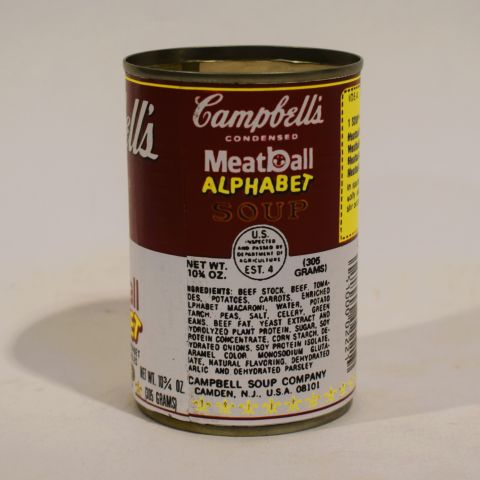 Dose A. Warhol: Meatball Alphabet Soup, Kunst und gestempelte Etiketten