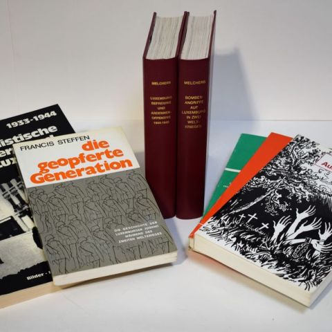 (War II) 2 Bücher von E.T. Melchers: 1. Bombenangriffe auf Luxemburg in zwei Weltkriegen, 1984 (gespickt mit 3 Dokumenten aus der Zeit). 2. Luxemburg Befreiung und Ardennenoffensive, 1944-1945, 1981 (mit einem Zeitdokument versehen). und 3. Henri Koch-Kent: 10. Mai 1940 in Luxemburg, Témoignages et documents, 1971. 4. Néckel Kremer: Aus dunkler Zeit, 1993 (enthält eine signierte autographe Sendung). 5. Louis Lefèbvre : La Bataille de Bastogne 19-12-1944 - 15-1-1945. 6. Francis Steffen: Die geopferte Generation, Die Geschichte der Luxemburger Jugend während des Zweiten Weltkrieges, 1976 (mit einem zeitgenössischen Dokument). 7. Henri Wehenkel: 1933-1944, Der antifaschistische Widerstand in Luxemburg, Dokumente und Materalien, 1985.