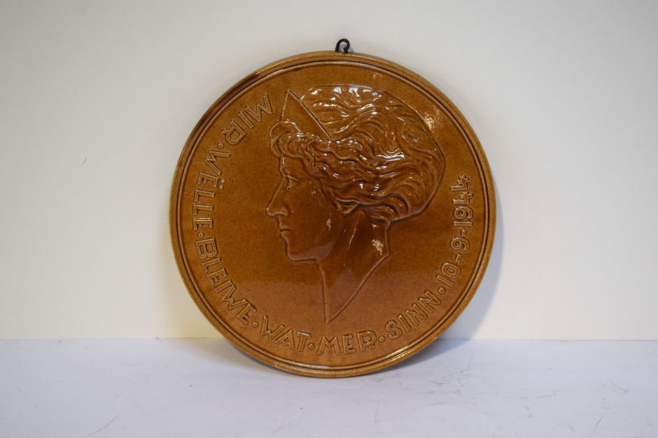 VILLEROY & BOCH, Medaille aus Steingut mit der Darstellung der Großherzogin. Inschrift MIR.WËLLE.BLEIWE.WAT.MER.SINN.10-9-1944. Auf der Rückseite markiert. Seltene braune Farbe, sehr guter Zustand. 23,5 cm.
