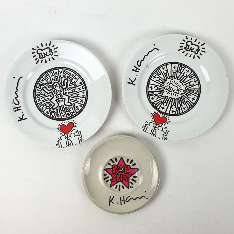 K. Haring (n.), Zusammenstellung von 2 Keramiktellern mit mehreren Motiven aus geklebtem Harz.