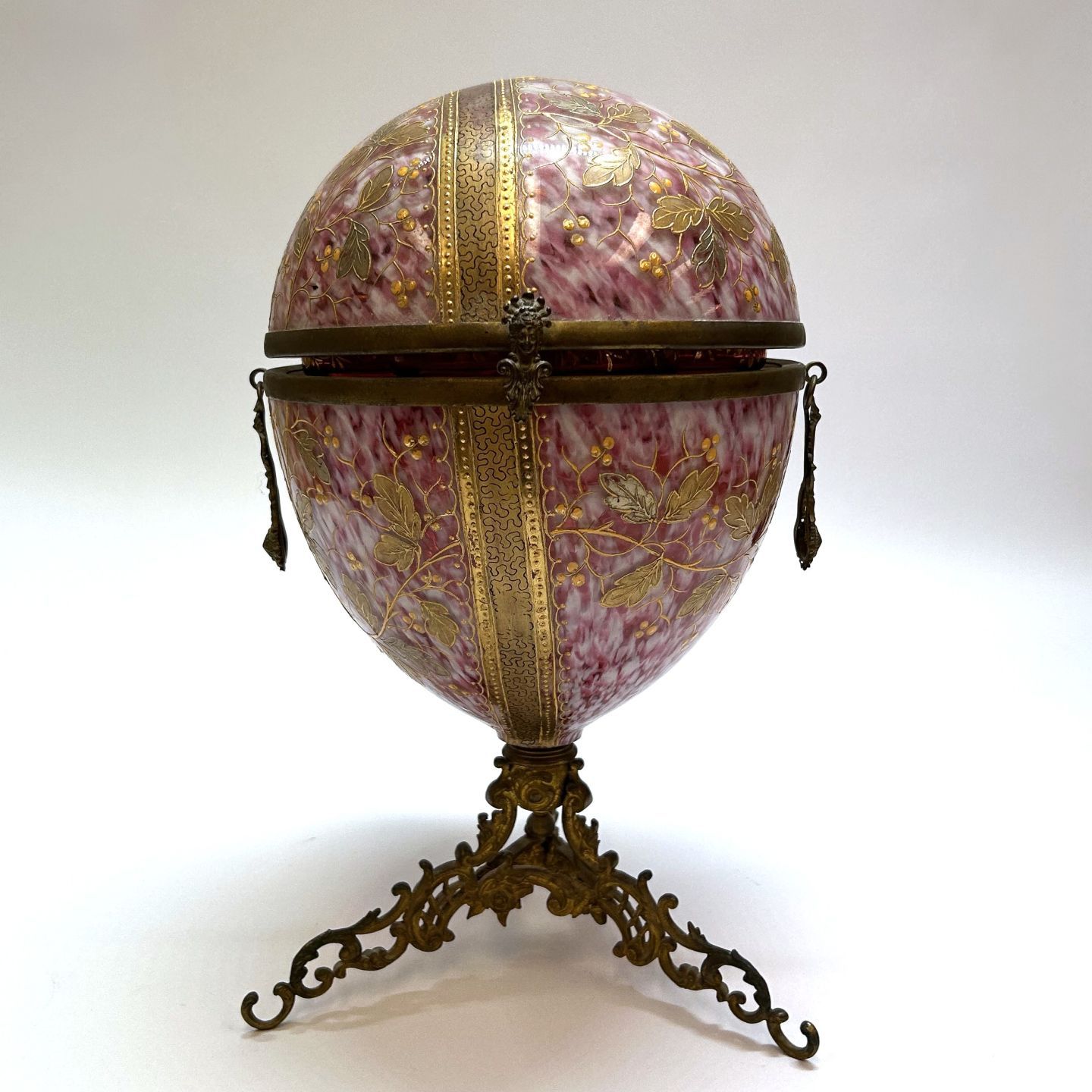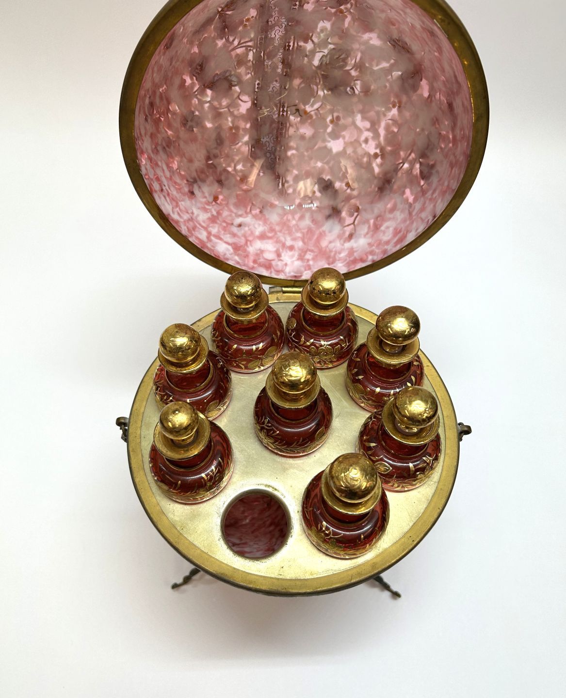 Antike Schatulle aus böhmischem Moser-Kristall, 9 dekorierte Flakons, 19.