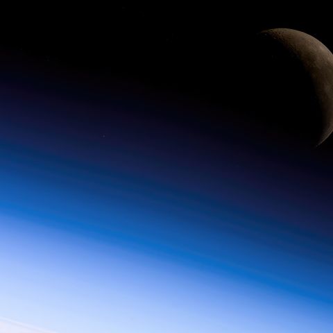 Photograph from Earth orbit. Rare view of a gibbous Moon