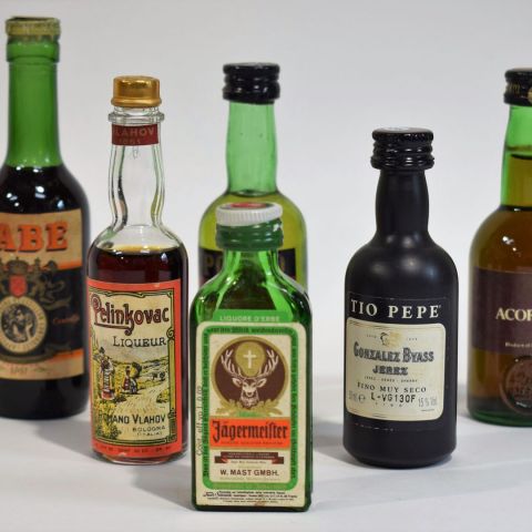 Reunion of 4 old mignonettes : Noirot extract 1. "Ratafia de Lorraine" & 2. "Curaçao rouge" to prepare your own liqueur (in their cardboard packaging), 3. Noirot extract "Crème de noyau" without packaging, 4. Elixir Vrignaud
