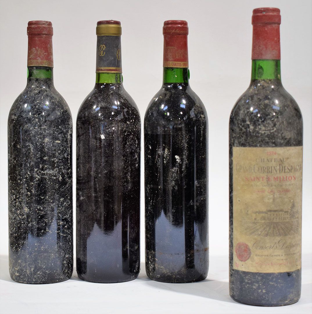 (MOULIS) 2 x Château CHASSE-SPLEEN, Moulis, no label, good level, 80's + Château GRAND CORBIN-DESPAGNE, Saint-Emilion, 1974, good level, dirty label + Bottle of Bordeaux without label, 80's, good level