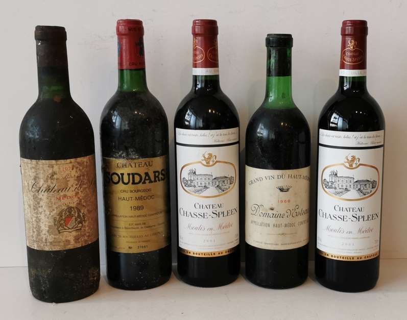 2 x Château CHASSE-SPLEEN, Red, MOULIS en MEDOC, 2001 + Domaine d'ESTEAU, Haut-Médoc, Red, 1966, Château SOUDARS, Red, Haut-Médoc, 1989 + Château de BY, Red, MEDOC, 1971