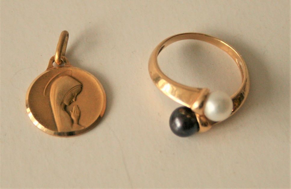 Gold medal of the Virgin Mary and gold ring with 2 white and black pearls - Gross weight: 5.48 g