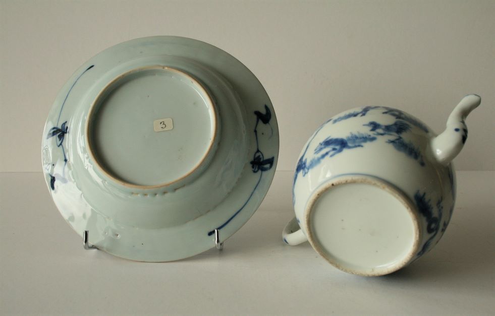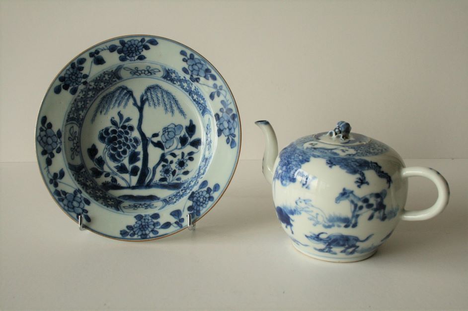 Blue and white porcelain cup and teapot, China, 18th century, The circular cup, decorated with willow and peonies, the teapot decorated with various animals (horse, rabbit, buffalo, mouse, etc...); accident to the handle and lid of the teapot - Diameter of the cup: 16 cm, Height of the teapot: 10 cm [Lot put back on sale following unpaid sale of 24 November 2019]