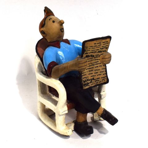 (TINTIN) Wooden figurine of Tintin reading a newspaper, seated on a rocking chair, from HERGÉ's comic strip "Tintin au Congo", height: 29 cm, hand-painted.