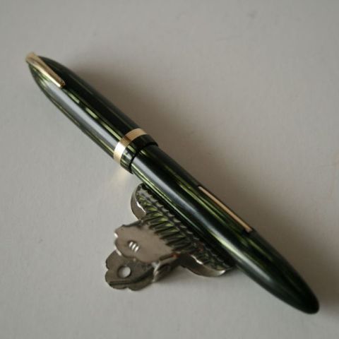 Fountain pen, W.A. SHEAFFER brand, burgundy celluloid and gold plated attributes, gold plated nib "SHEAFFER's Regus Patoff. 14 K", 1930's - Length : 132 mm, Weight : 13,1 g