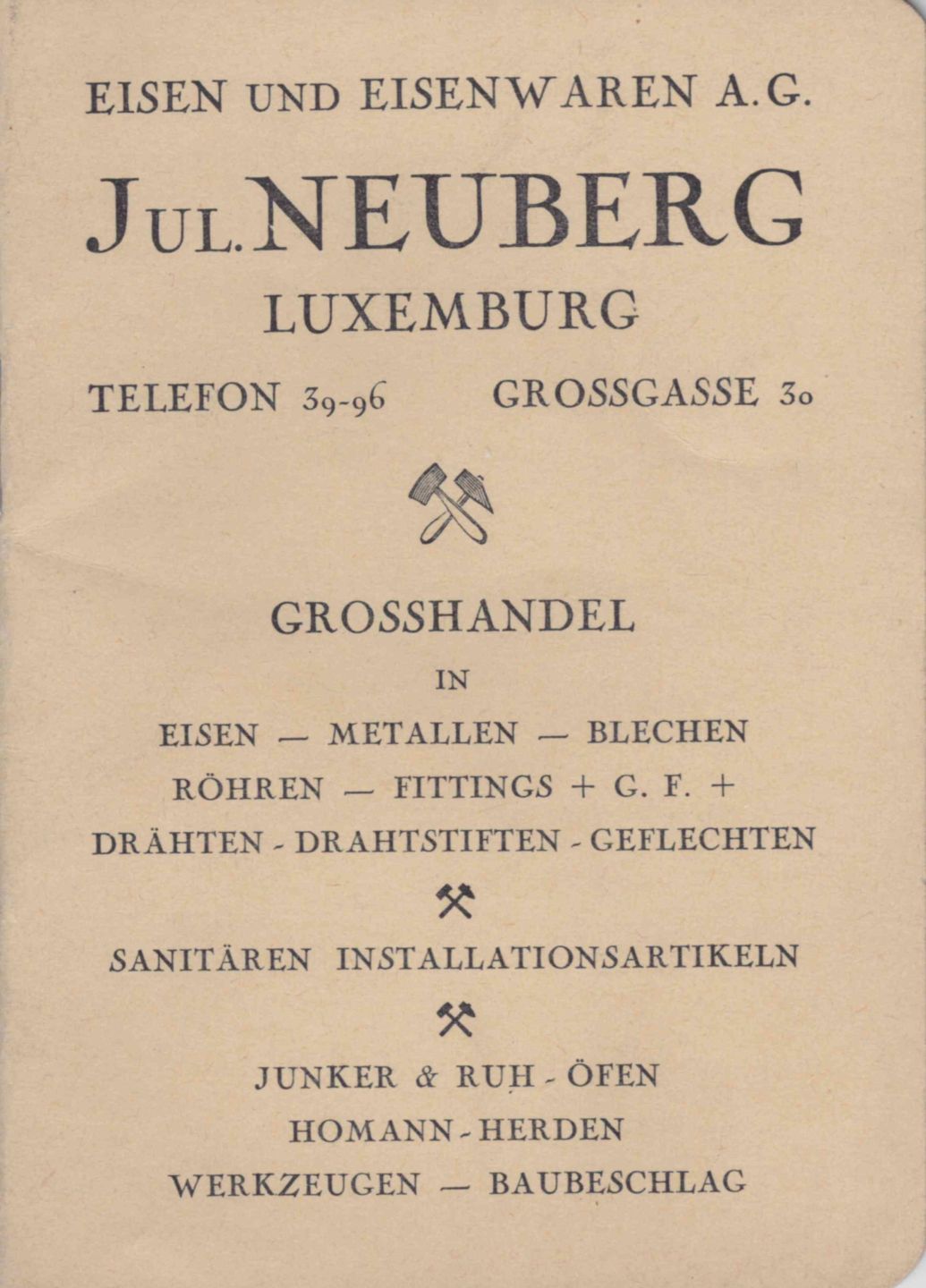 1942 trade catalog by Jul. NEUBERG Luxemburg, Grosshandel in Eisen-Metallen..., Luxemburg, Druck von Joseph BEFFORT, very good condition, 14.5 x 10.5 cm