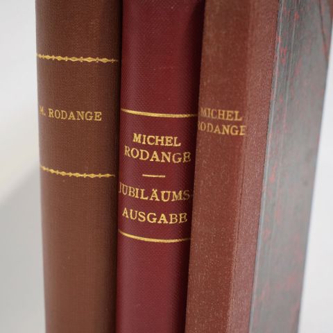 Collection of works on Michel RODANGE: 1. Gesammeltes aus dem Nachlass des Dichters, Luxemburg, Linden & Hansen, 1929, 2. Jibiläumsausgabe, Bearbeitet von Joseph Tockert, Luxemburg, Linden & Hansen, 1927, 3. Jahrhundertfeier 1927, Luxemburg, Linden & Hansen, 1926, Bound with Michel Rodange der Dicter des "Renert", Grevenmacher, 1927, Bound with "Renert", Neue Volkausgabe mit 14 originalkopfleisten von Raymond Mehlen, 1940