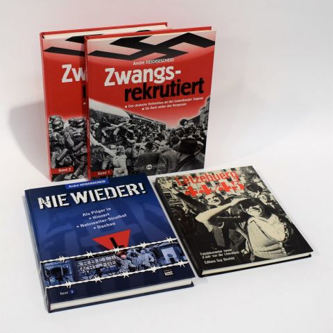 Reunion of books on World War 2: 1. André HEIDERSCHEID: Tome I. Das deutsche Verbrechen an der Luxemburger Jugend, Ein Buch wider das Vergessen, 2000 & Tome II. Das deutsche Verbrechen an der Luxemburger Jugend, Noch ein Buch wider das Vergessen, 2001, 2. Lêtzebuerg 44/45 Fotodokumenter iwwer d'Joër vun der Liberatioun, éditions guy Binsfeld, 3. André HEIDERSCHEID: Nie Wieder!, Tome 2, 2007