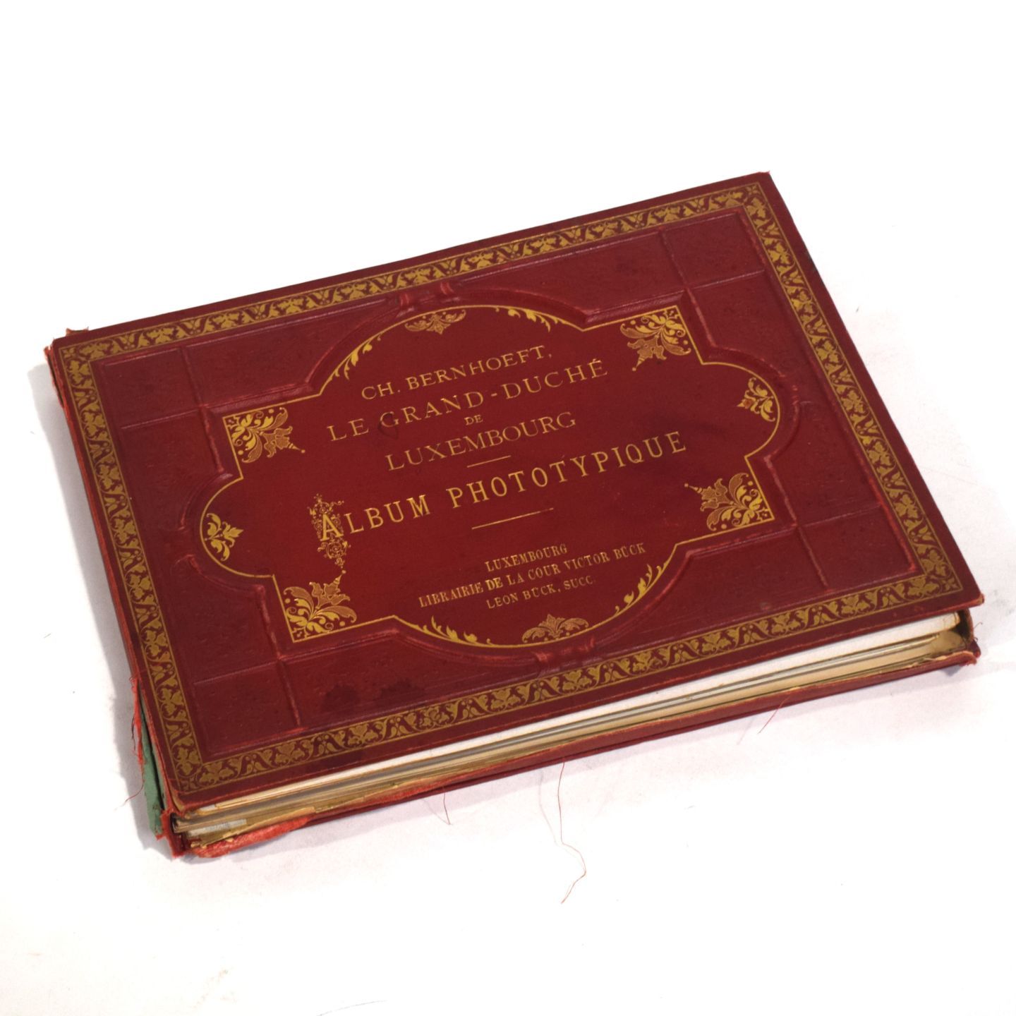 Rare work by Charles BERNHOEFT: Le Grand-Duché de Luxembourg published in Luxembourg, Librairie de la Cour Victor Bück, Léon Bück succ.., silver label of H. Fikentscher Leipzig, Portfolio of 80 plates of phototypical views on strong cardboard, red percaline cover (tears at spine), first cover embossed and gilded, 3 flaps, one detached, complete with first 3 descriptive leaves (title, recommended houses, plates), publication date 1891, appreciable set despite wear and tear to percaline [Edmond THILL & Co-authors: Charles BERNHOEFT "Photographe de la Belle Époque", #3 page 628].