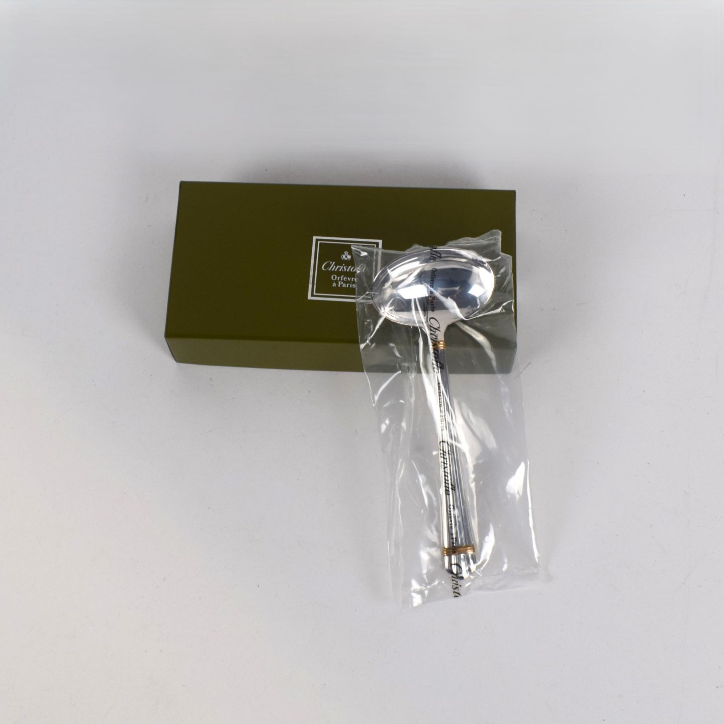 Christofle golden sauce spoon model Aria, mint condition, in plastic case