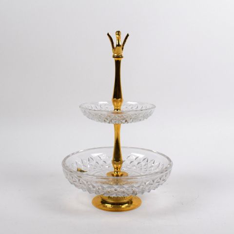 VAL SAINT LAMBERT. Servant composed of two cut crystal trays, 24ct gold-plated mounting, and topped by an elegant swan. Antique label signed under the base. Height: 24 cm