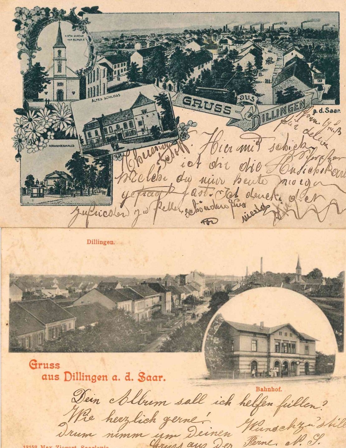 1) Gruss aus Dillingen a. d. Saar, Max Ziegert Saarlouis edition, stamped (green 5) but not traveled, ca. 1900