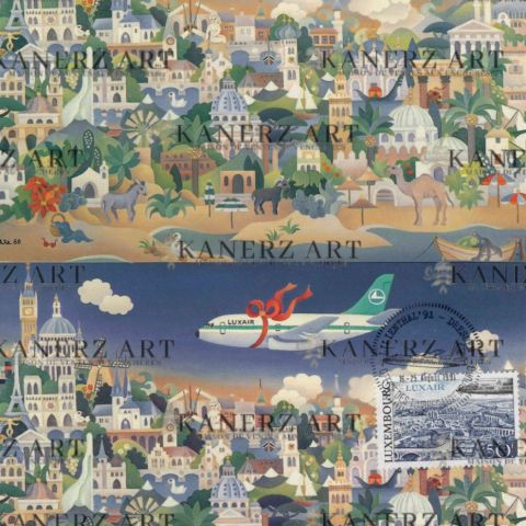 Reunion of 6 postcards of the "LUXAIR: le plaisir de voyager en avion", designed in 1988 by Annette, 2 with stamp and postmark "Lillenthal'91-Desden".
