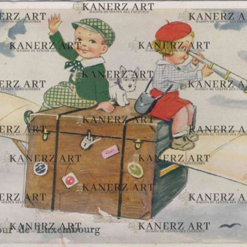 Postcard from a "Bonjour de Luxemburg" flying trunk, the flap on the trunk revealing the accordion of black & white photos of the city, early 1950s, E.A. Schaak Luxembourg