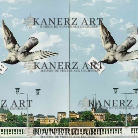 Reunion of 2 postcards "Gruss aus Luxemburg" with a dove over the Adolphe Bridge, ca 1980, Messagerie Paul Kraus