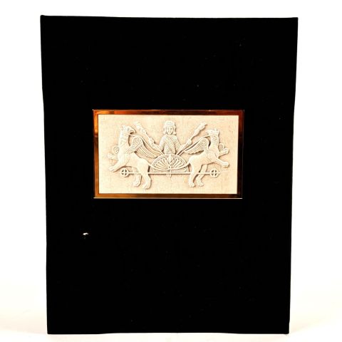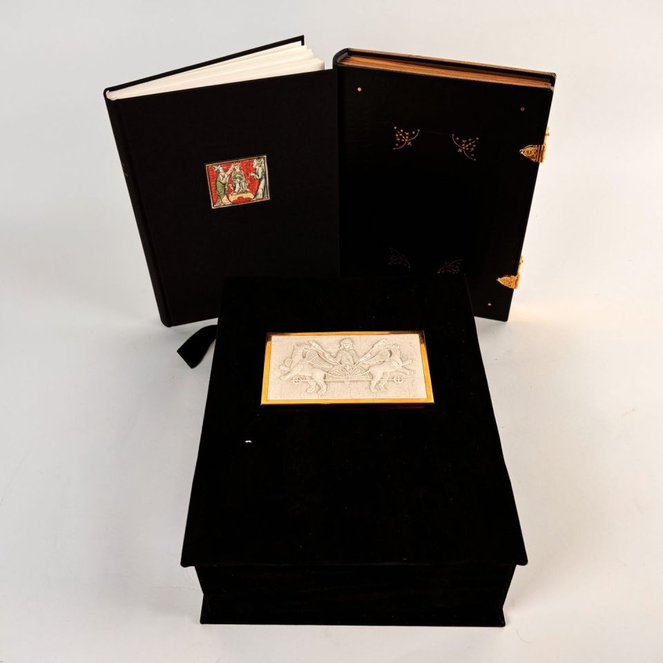 Explanatory volume and full-leather book with gilt clasp featuring the original illuminated text.