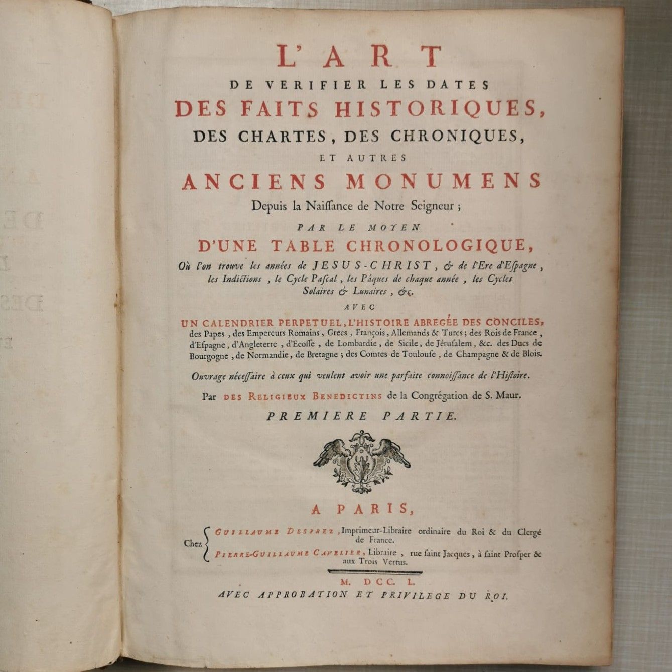 HISTORY. L'Art de verifier les dates des faits historiques, des chartes, des chroniques, et autres anciens monumens, Depuis la Naissance de Notre Seigneur; Par le moyen d'une table chronologique, où l'on trouve les années de Jésus-Christ, & de l'Ere d'Espagne, les Indictions, le Cycle Pascal, les Pâques de chaque année, les Cycles Solaires & Lunaires, etc.[. [By Benedictine monks of the congregation of S. Maur.