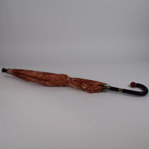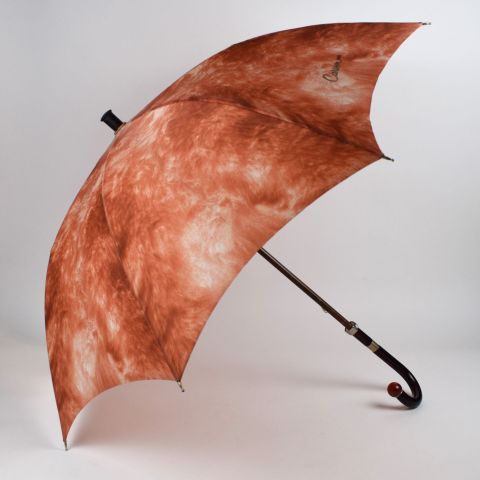 CARVEN. Umbrella with orange fabric, wooden shaft, translucent bakelite handle and round knob imitating amber.
