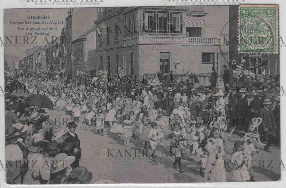 Ettelbruck historical postcard: Blumenfest 1913 and its festive parade
