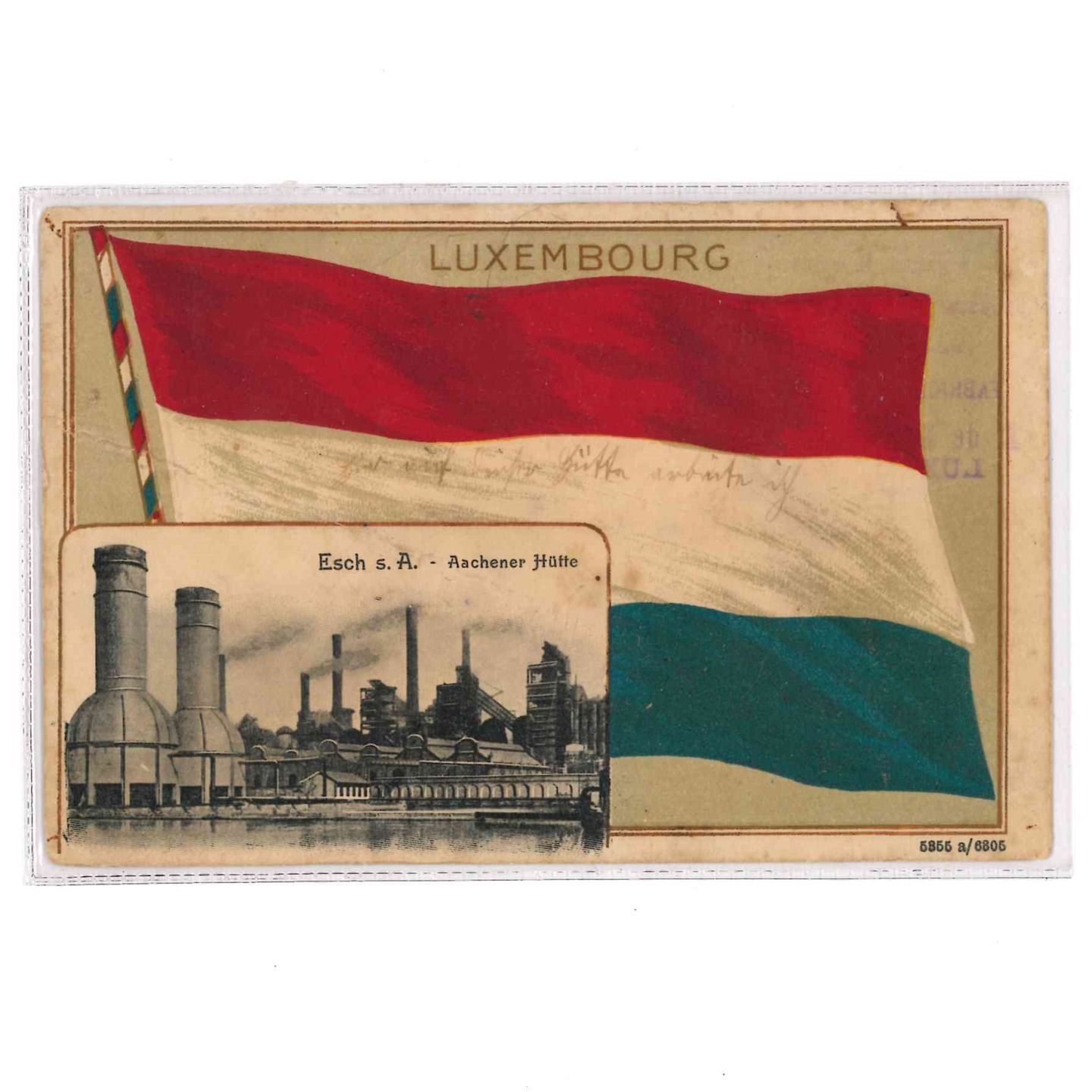ESCH. Postcard of the Luxembourg flag with a vignette of the Aachener Hütte in Esch/Alzette, ca 1910.
