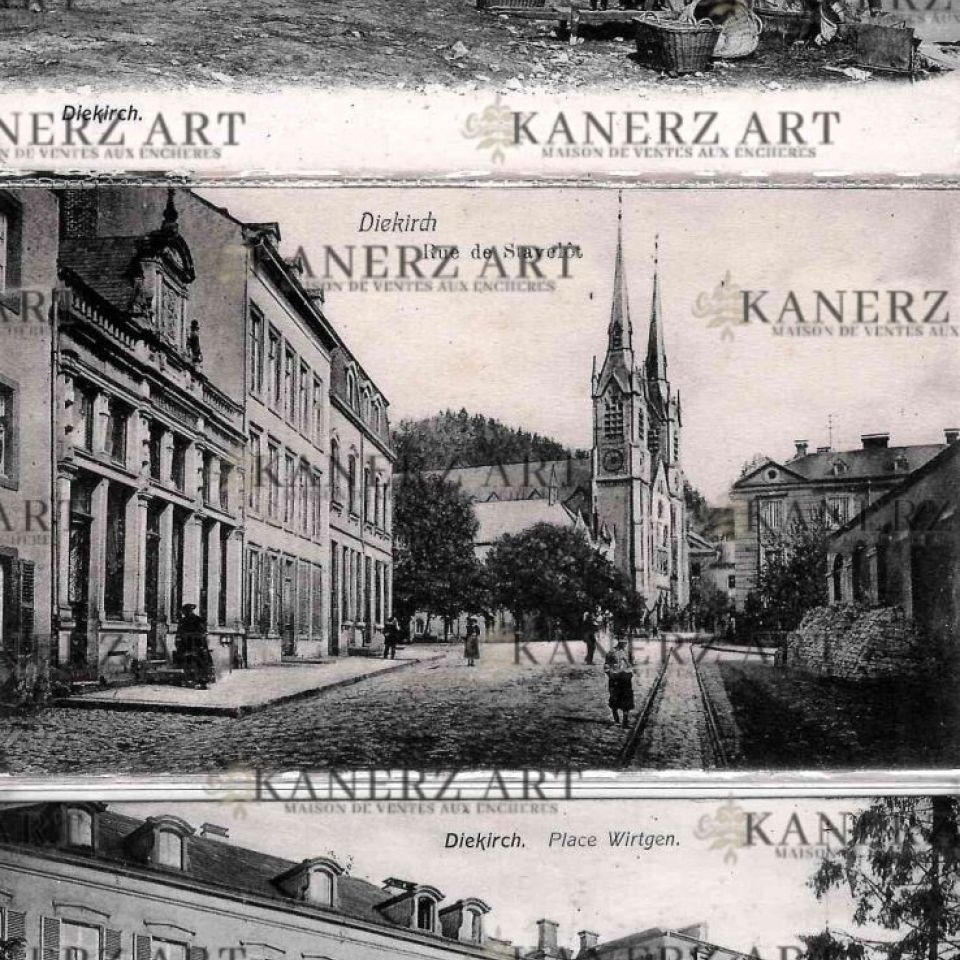 DIEKIRCH. Reunion of 5 postcards, Th. MANNON-CHAMPAGNE edition: 1) Palais de Justice, 1901, 2) L'Esplanade, 1907, 3) Place Wirtgen, 1910, 4) Rue de Stavelôt, ca 1900, 5) Les Lavandières, ca 1905