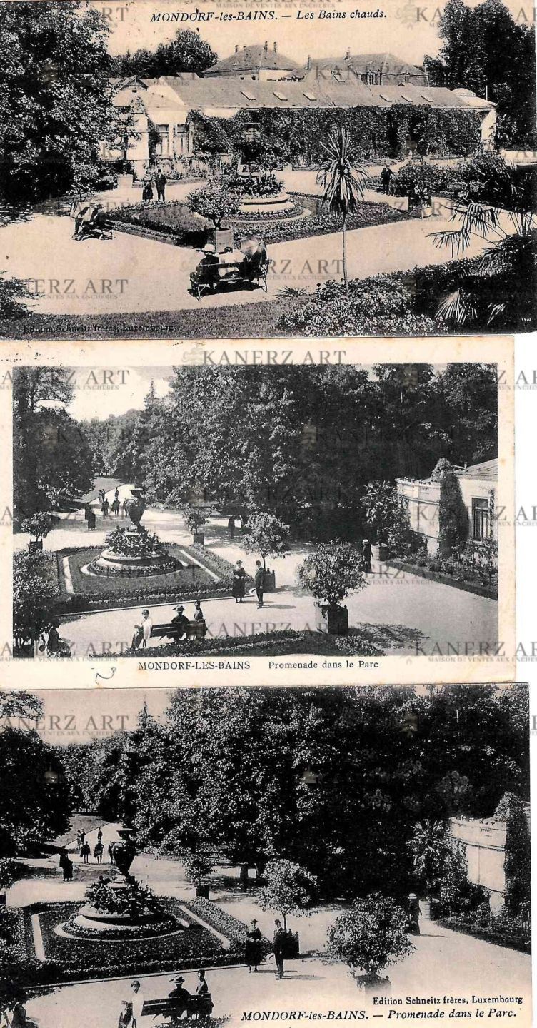 MONDORF. 1. Les Bains chauds, Schneitz frères (Luxembourg)/Daniel Delboy (Mirecourt), 1925 and 2 x Promenade dans le Parc, Schneitz-Roussy (Mondorf-les-Bains), 1921 and ca. 1920, one without text + not traveled (From the Norbert HANSEN collection)