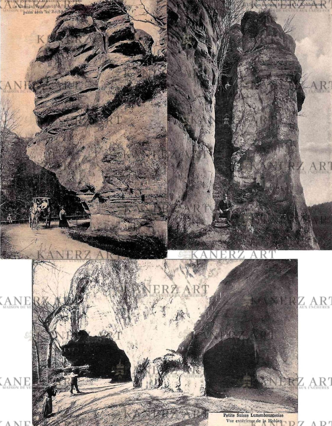 MULLERTHAL . 1. The Vogelsmühle-Berdorf Road, J.M. Bellwald, No. 611,1929, stamp has been withdrawn, 2. One of the rocks forming the Kohlscheuer, J.M. Bellwald, No. 620, 1926, 3. Exterior view of the Hohlay, J.M. Bellwald, No. 116b, ca. 1920, no text + not travelled (From the Norbert HANSEN collection)