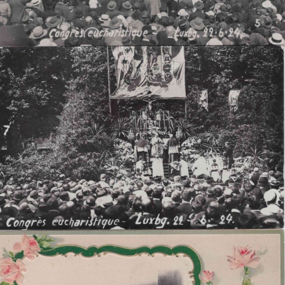 Reunion of postcards and photo cards: 1) 2 photo cards of the Luxembourg Eucharistic Congress 1924, 2) Cathedral Altar (ca 1900) and St. Joseph Mission Altar (ca 1930), 3) 2 cards of the Virgin Consoler ca 1900 and the other ca 1920