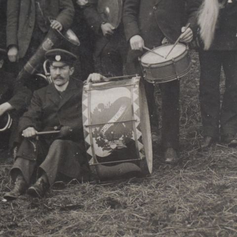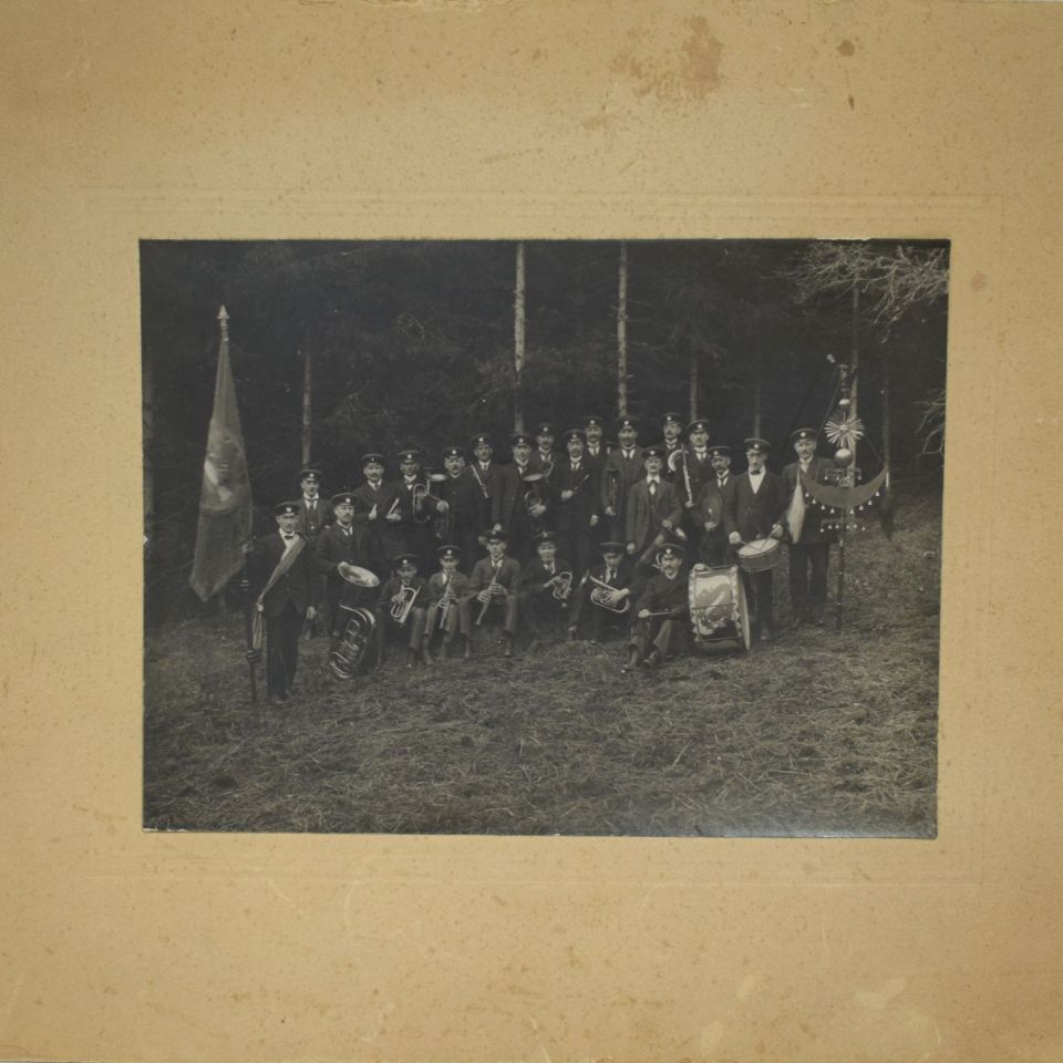 Large laminated photograph of the Neuerburg brass band, ca. 1900, 17 x 22.5 cm