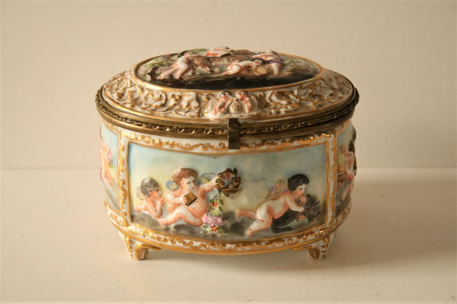 Ovoid porcelain box decorated with playing putti, beautiful interior lined with copper, CAPODIMONTE late nineteenth - Dimensions: 12 x 10 cm, Height: 9.5 cm