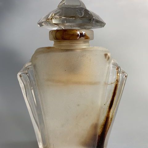 Perfume bottle (empty): Les Liserons by LORENZY-PALANCA, Paris, gilded rectangular label, pyramidal stopper (a small chip), glued glass with translucent central part, 20/30s - Height: 12 cm