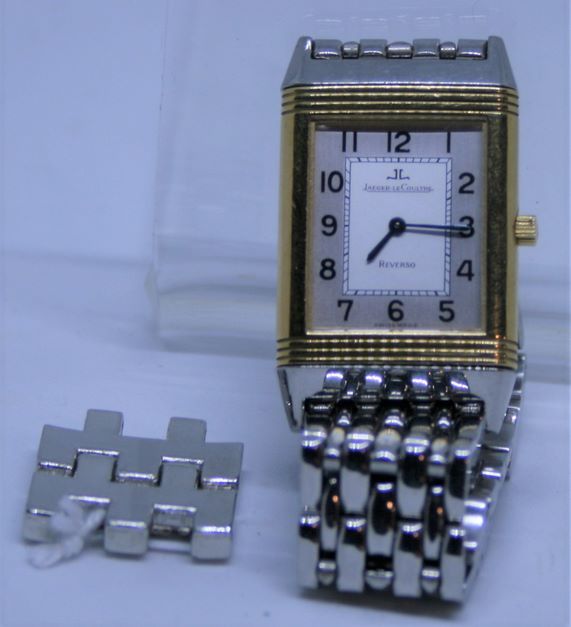 Mechanical wristwatch, JAEGER LECOULTRE model REVERSO, # 250.5.86, circa 1990, reversible rectangle case in gold and steel, silver dial with painted Arabic numerals, blued steel hands, branded steel bracelet with articulated links (additional links), Good condition - Dimensions: 23 x 33 mm, Thickness: 7 mm