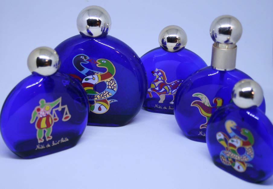 Perfume "Eau Défendue" by Niki de SAINT PHALLE, 5 different bottles (empty) - Height : from 7,5 to 11 cm