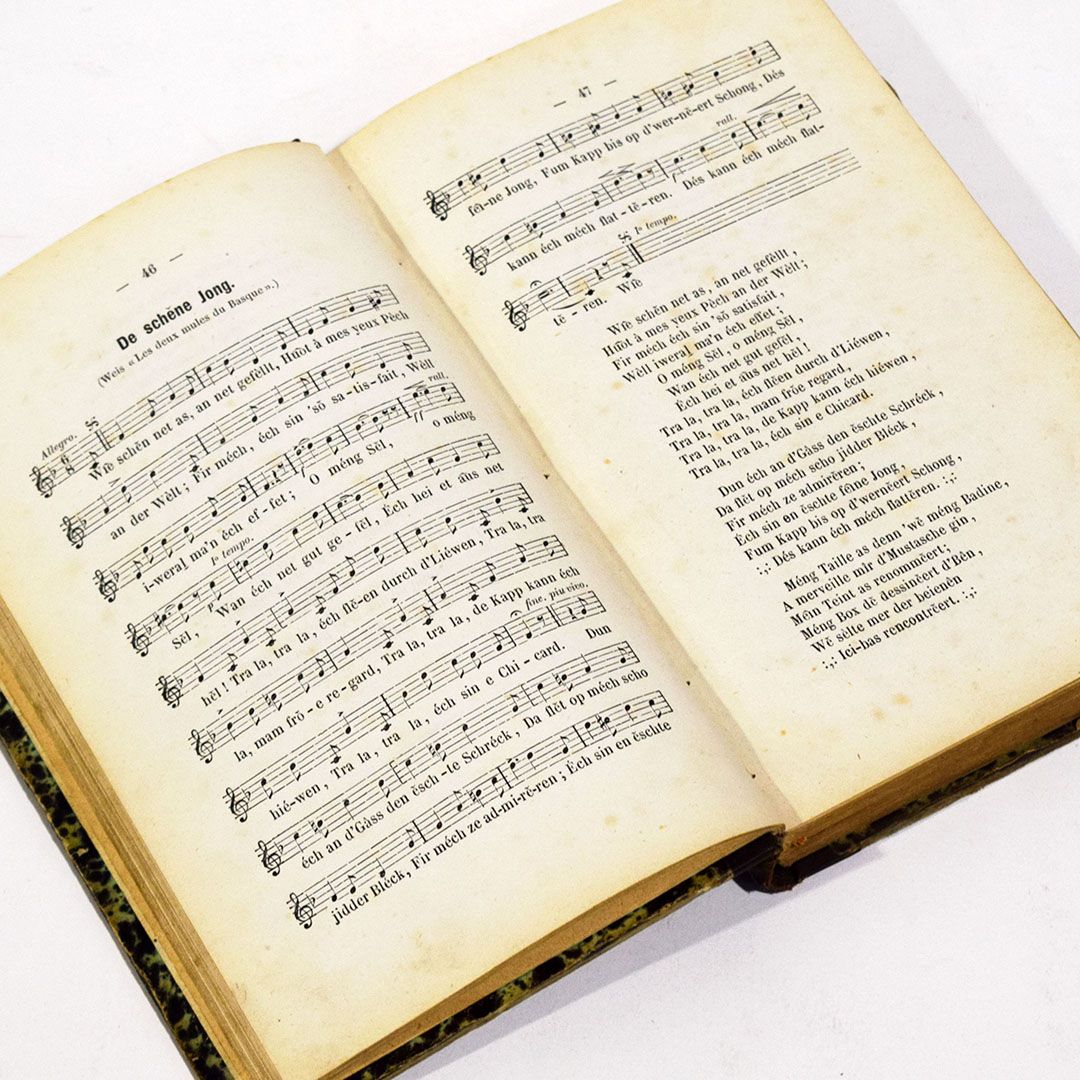 Michel LENTZ: Spâss an Iérscht, Liddercher a Gedichten, printed by V. Bück, 1873, has a circular stamp "Ons Hemechtssprooch LÜTTICH 1881" on the cover page