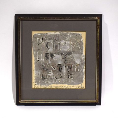 Theo KERG (1909-1993), Freedom of Activity, Mixed media (sand, charcoal, paper) with personal text by the artist for the silver anniversary of the German art critic Heinrich HAHNE (1911-1996), dated October 68 and signed, 39,5 x 37 cm