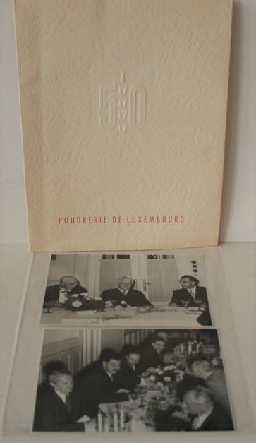 50 years of the Poudrerie de Luxembourg 1906-1956, Printed by Bourg-Bourger, Luxembourg, Layout and drawings by Max Weyer + 2 photos by Pol ASCHMAN of the Gala dinner on the occasion of the 50 years