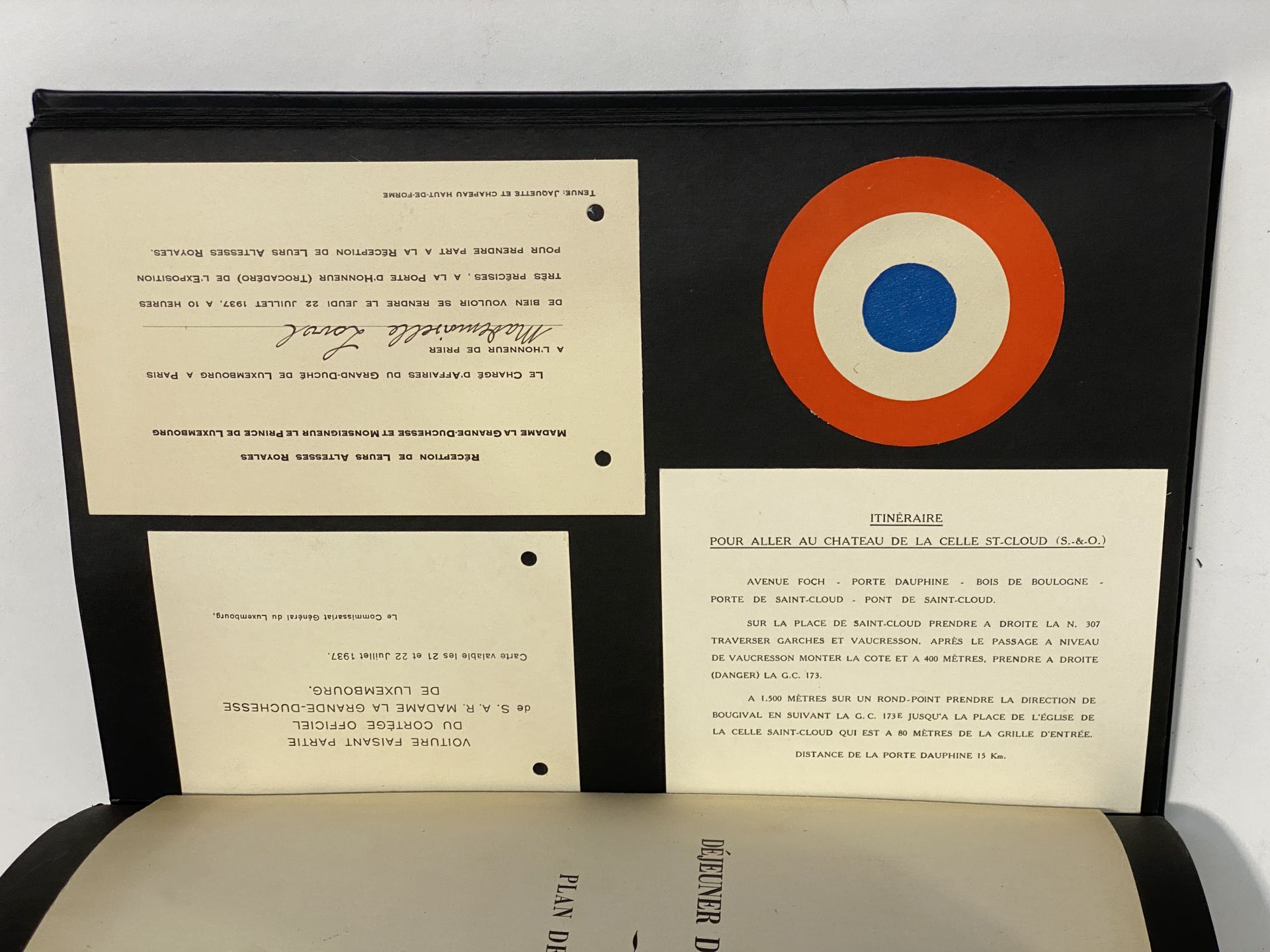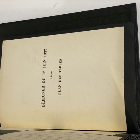 Exceptional tabbed album featuring large-format photographic prints of the construction of the Luxembourg Pavilion for the Exposition, the interior, and ceremonies including the inauguration by Grand Duchess Charlotte. Also included are invitation cards: 1) Entertainment offered by Radio-Luxembourg at the Château de la Celle-St-Cloud on June 12, 1937 with the Harmonie d'Esch/Alzette, evening of the official inauguration, 2) Invitation card for the Official Inauguration by Le Commissaire Général, at half past noon on June 12, 3) Reception in the presence of their RAs on July 22, with card "Voiture faisant partie du cortège officiel de SAR Madame La Grande-Duchesse de Luxembourg and 2 invitation cards (one blank and the other in the name of Mademoiselle Laval) and an itinerary card and a national cockade, 4) The seating plan for the luncheon on June 12, 1937, 5) An envelope from the Commissariat Général + 10 negatives of private photographs, certainly taken by the guest on this inaugural day.