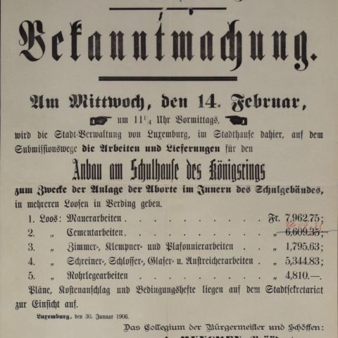 Invitation to tender for building work (including a gymnasium) at the Clausen school, 1905, Luxemburg, Druck von Viktor Beffort, good condition despite a small loss at the top, 43.5 x 34.5 cm