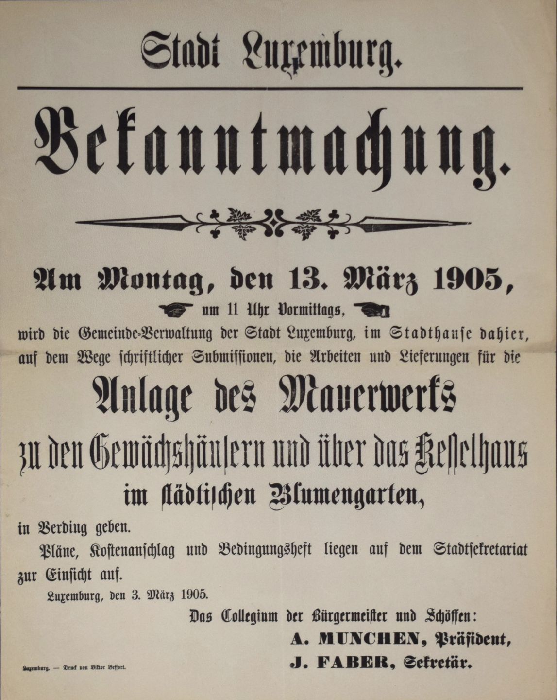 Invitation to tender for work on the City of Luxembourg greenhouses, 1905, Luxemburg, Druck von Viktor Beffort, fine condition, 43.5 x 34.5 cm