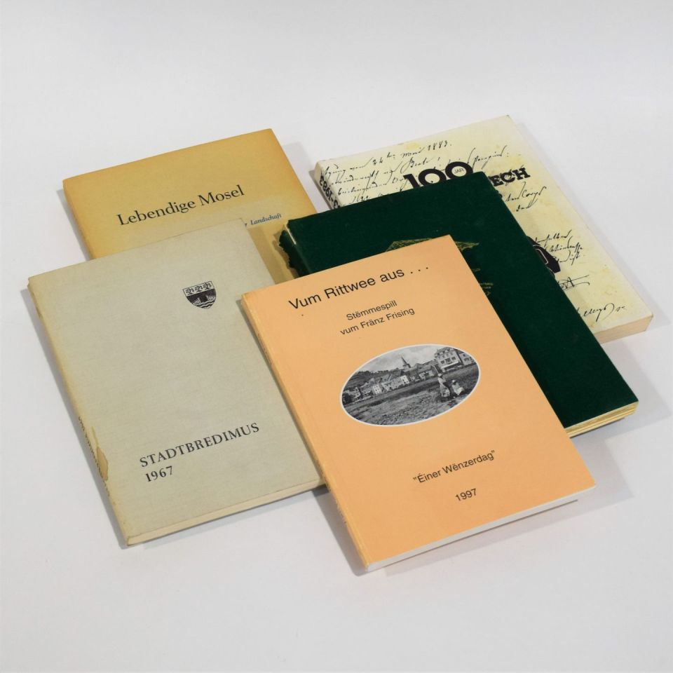 1) Fränz FRISING: Vum Rittwee aus... "Éiner Wënzerdag", 1997, 2) 100 Jar Pompjeen Bech 1883-1983, 3) Notre Moselle Notre Vin, Iie Fête du vin de Schwebsingen, 1954, 4) Lebendige Mosel, Melodien einer Landschaft, Schwebsingen 1960, accompanied by a letter on the letterhead of Imprimerie BOURG-BOURGER to the daily newspaper "La Meuse" in 1960 for publication in the paper, 5) XIe Fête du vin de Stadtbredimus 1967