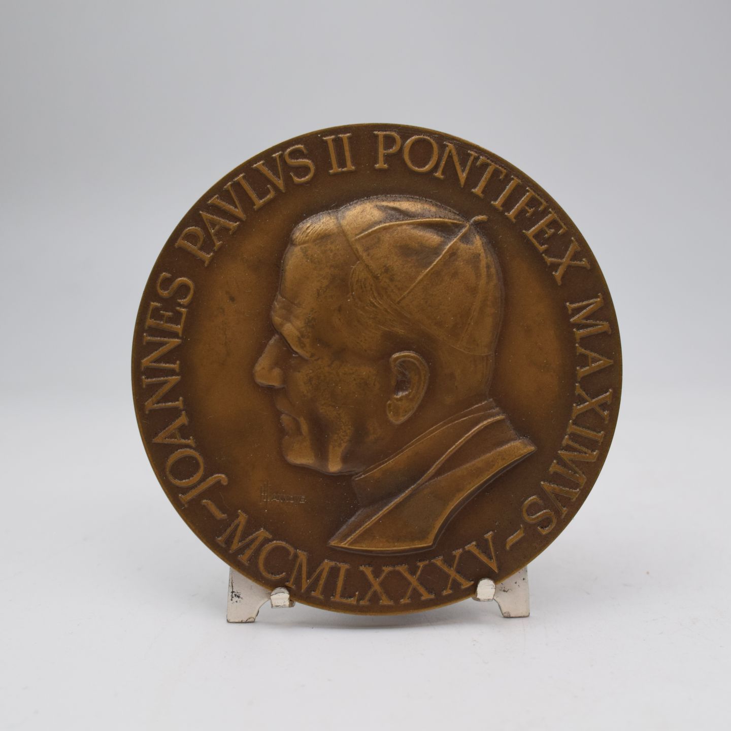 Bronze medal issued on the occasion of Pope John Paul II's visit to Luxembourg in 1985, Notre-Dame de Luxembourg on reverse, design by H. LANNOYE, Fisch FONSON workshop, Plexiglas easel, diameter 70 mm.